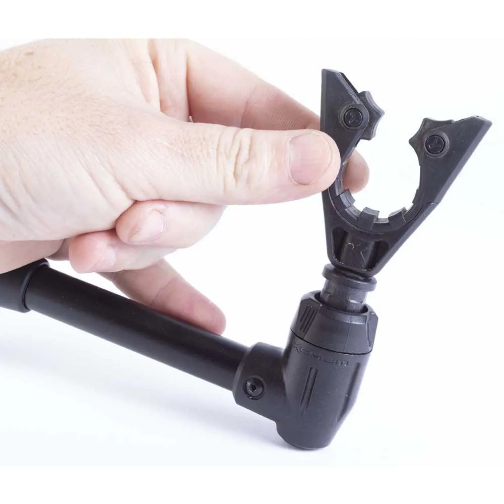 Simplemente ajuste la barra al ángulo que necesita para pescar, luego fíjela en su lugar atornillando su balancín o el accesorio del brazo alimentador.